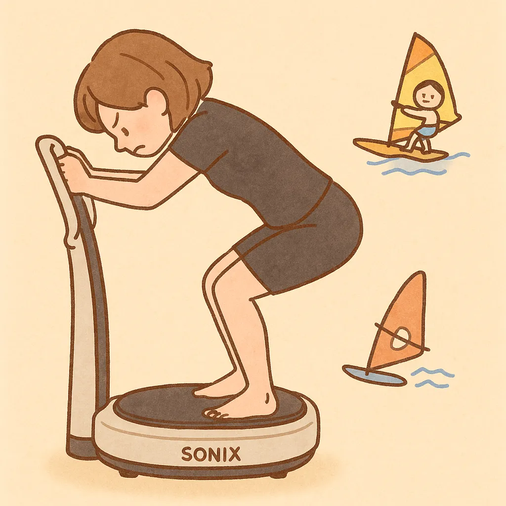 SONIXの空気椅子ポーズは太ももや腰に効果的。振動で筋肉深部まで刺激し、姿勢改善や…